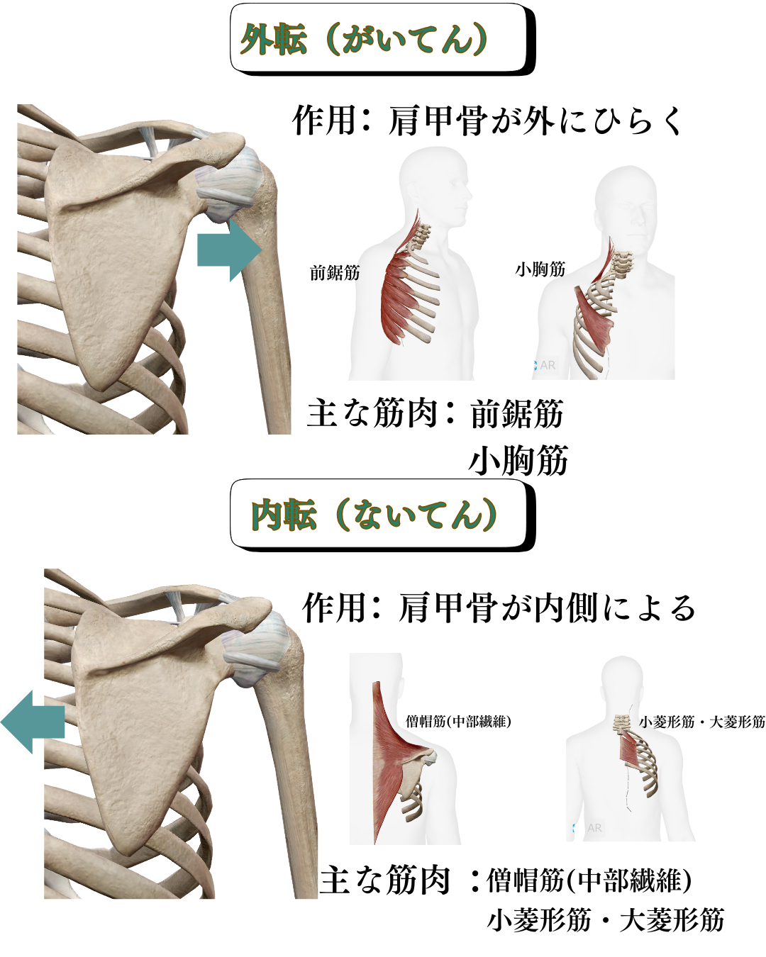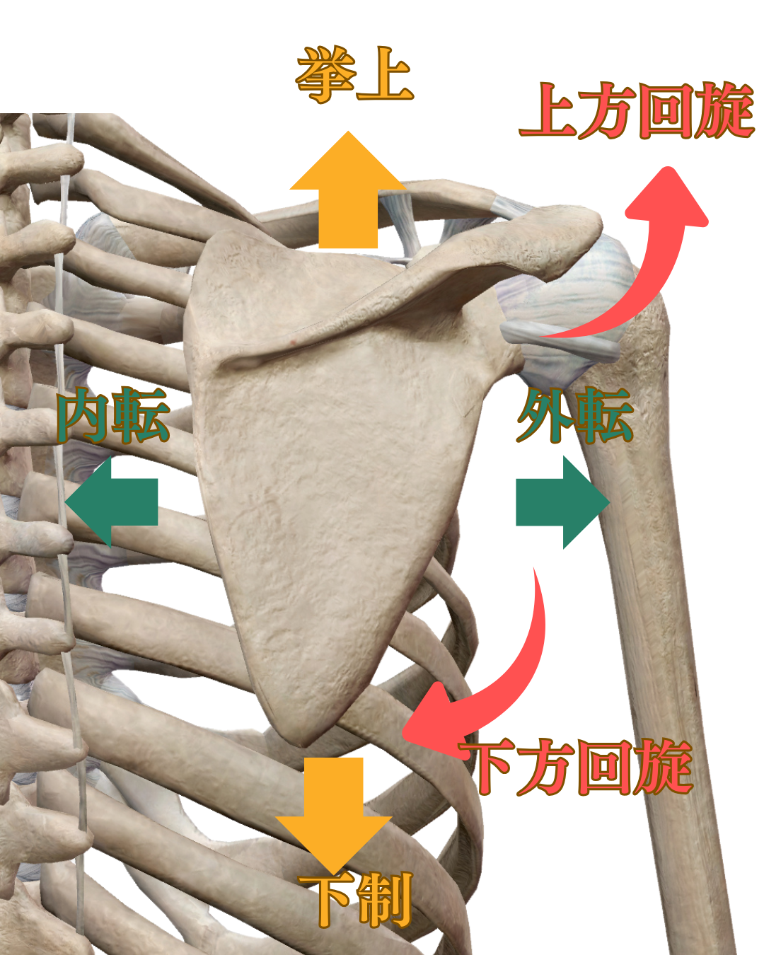 外転・内転・挙上・下制・上方回旋・下方回旋といった動きは、肩こりや猫背・巻き肩の改善にも関わります。