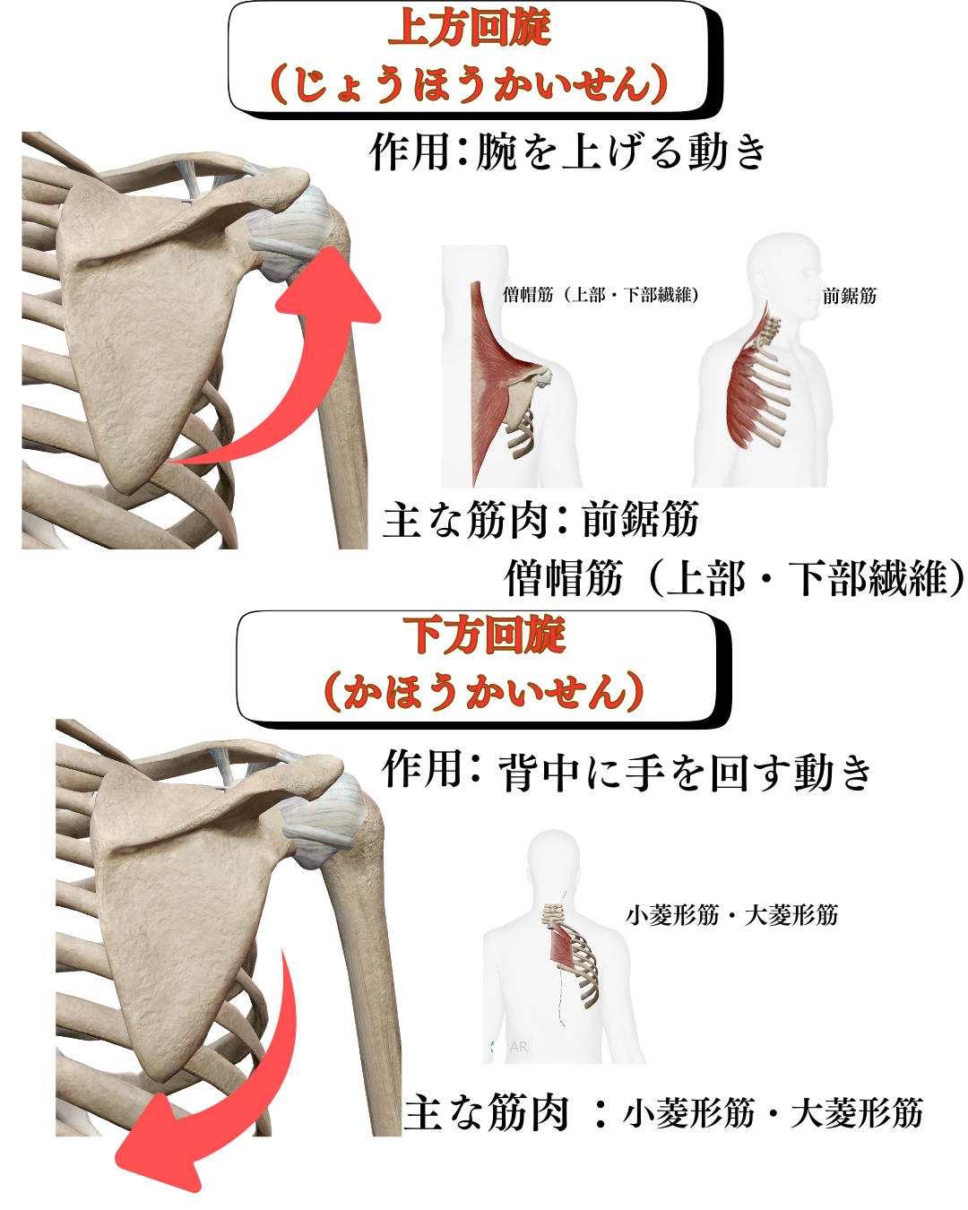 腕を上に上げるときに、肩甲骨が外上方向に回旋します。