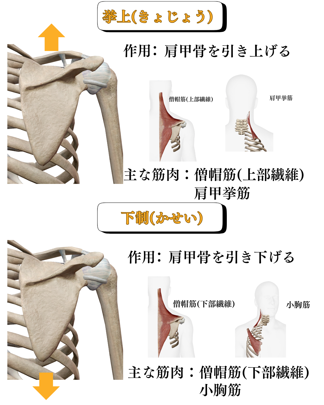 挙上の逆で、肩甲骨が下がる動き。